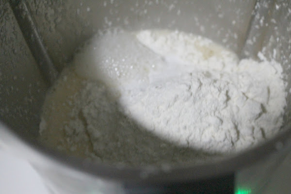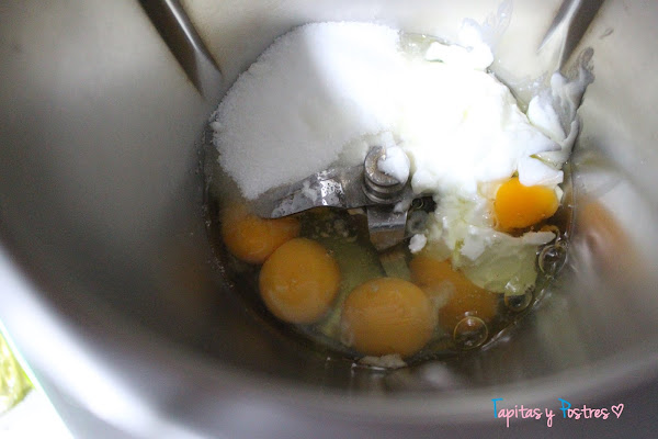 En el vaso de la thermomix (o de una batidora eléctrica) vamos a poner los huevos, el yogur y el azúcar y batimos bien 1 minuto a velocidad 3.