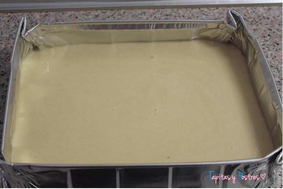 Vertemos la masa en un molde rectangular que habremos engrasado. Al horno.