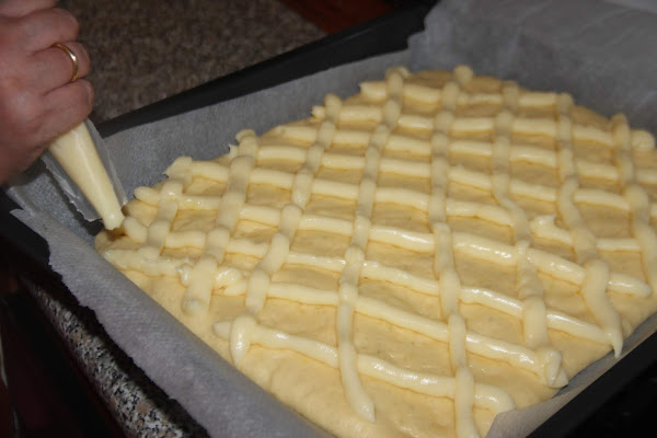 Dejamos reposar hasta que la masa vuelva a levar (en este caso será un levado más breve, de una hora aproximadamente). Tras este levado final decoramos con unas tiras de crema pastelera, o crema de chocolate si nos gusta más.