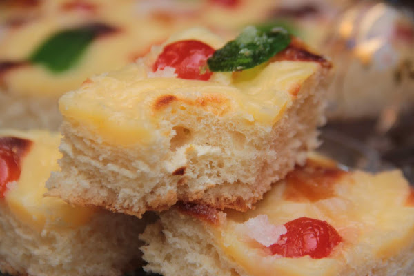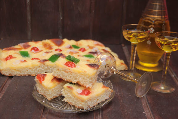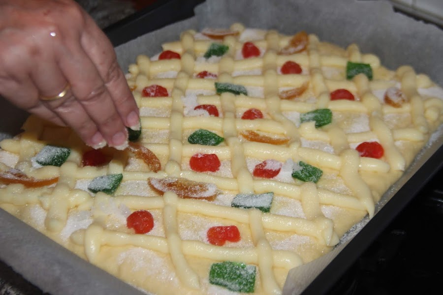 Colocamos frutas confitadas y espolvoreamos con azúcar blanquilla de forma generosa. Finalmente la espolvorearemos con más azúcar en grano pero en este caso humedecida con unas gotas de agua.