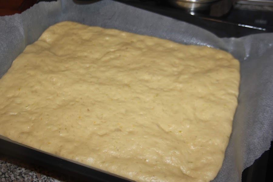 Una vez que la masa haya levado (me olvidé hacer foto) la colocamos sobre una lámina de papel de hornear, la presionamos ligeramente para desgasificarla y la estiramos con un rodillo hasta obtener un grosor de aproximadamente 1,5 centímetros. Si vemos que esta pegajosa en exceso y no podemos usar bien el rodillo no hay problema, lo podemos hacer con las manos engrasadas en un poquito de aceite.