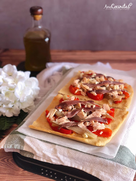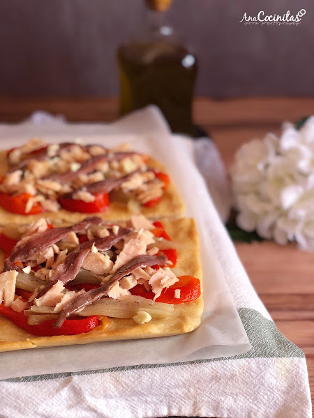 5. Finalmente montamos la coca añadiendo las verduras, el ajo, el atún, las anchoas y terminamos con un chorro de aceite de oliva.