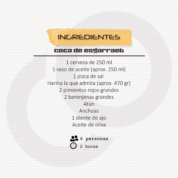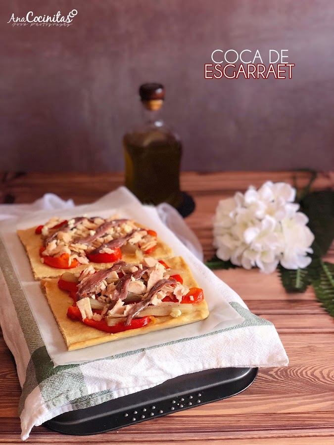 Hoy os traigo la coca de esgarraet, un plato típico de pimiento y berenjenas asadas que acompañamos con una fácil masa de cerveza, que no necesita levado y con unos "toppings" variados como atún, anchoas, bacalao, mojama, etc.. que hacen que nuestra coca se eleve a un nivel superior.