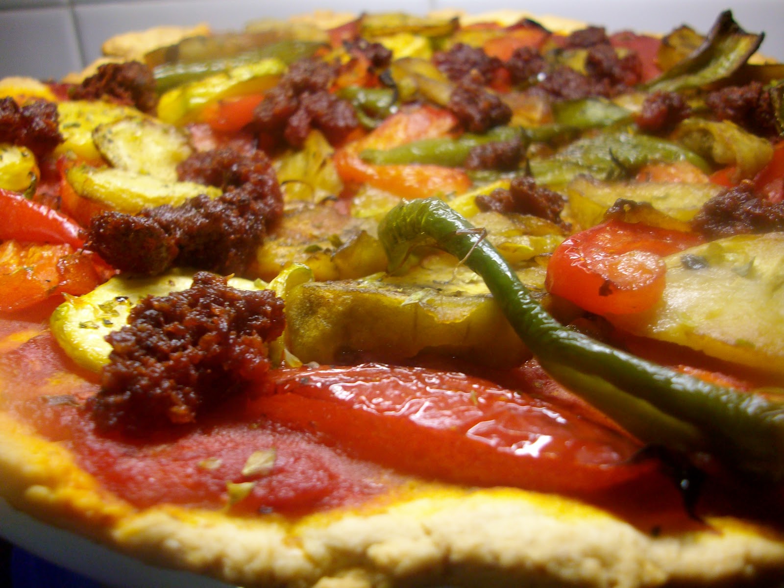 en la base poner el tomate frito.....por encima las hortalizas..con la sobrasada y espolvorear bien de oregano