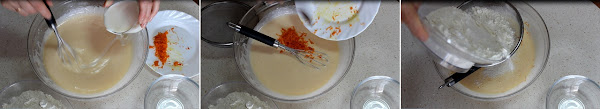 Batimos los huevos con el azúcar, hasta que blanqueen, añadimos el aceite, el zumo de naranja, la ralladura y la harina con los gasificantes o la levadura tamizadas.