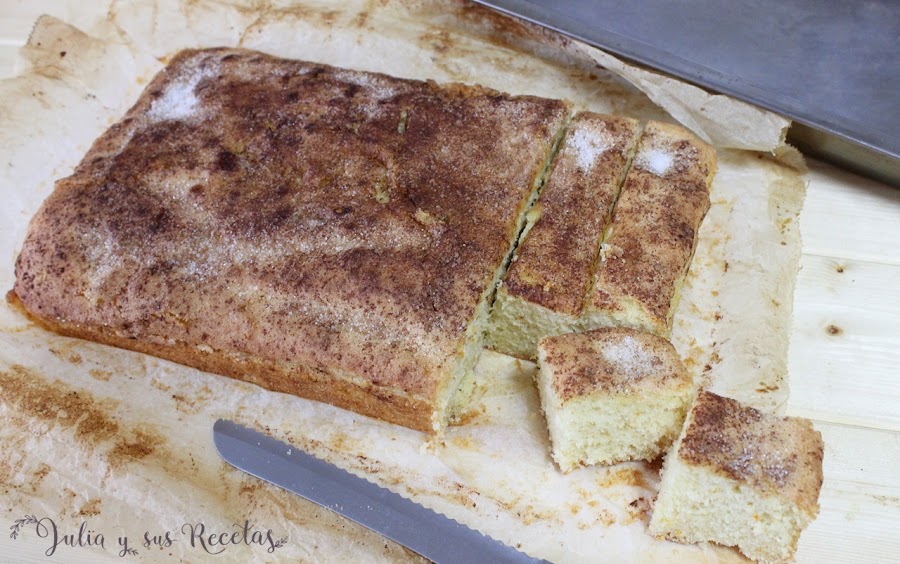 La espolvoreamos con bastante azúcar y canela y la metemos al horno precalentado a 180ºC durante 25-30 minutos dependiendo del horno, con calor arriba y abajo sin aire. Si vemos que se dora demasiado , la tapamos con un papel aluminio.
