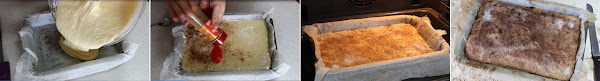 Forramos un molde rectangular con papel de horno (yo lo humedezco un poco con agua para que se ajuste mejor) y echamos la masa.