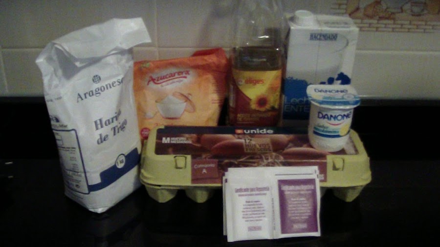Batir y mezclar los dos vasos de azúcar con los tres huevos. Luego añadir el aceite, la leche, la ralladura de limón, el yogur, los 500 gramos de harina tamizados y los papelillos de gaseosa.