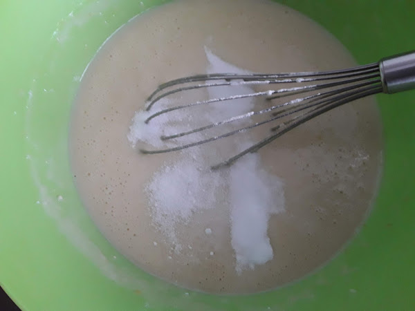 cuando vemos que no queda ningún grumo y que la masa haya quedado ligera procederemos a incorporar los sobres de gasificante (los pondremos los 4 juntos) y mezclaremos con las varillas con movimientos suaves y envolventes y veréis como empiezan a hacer burbujitas eso es por los gasificantes,