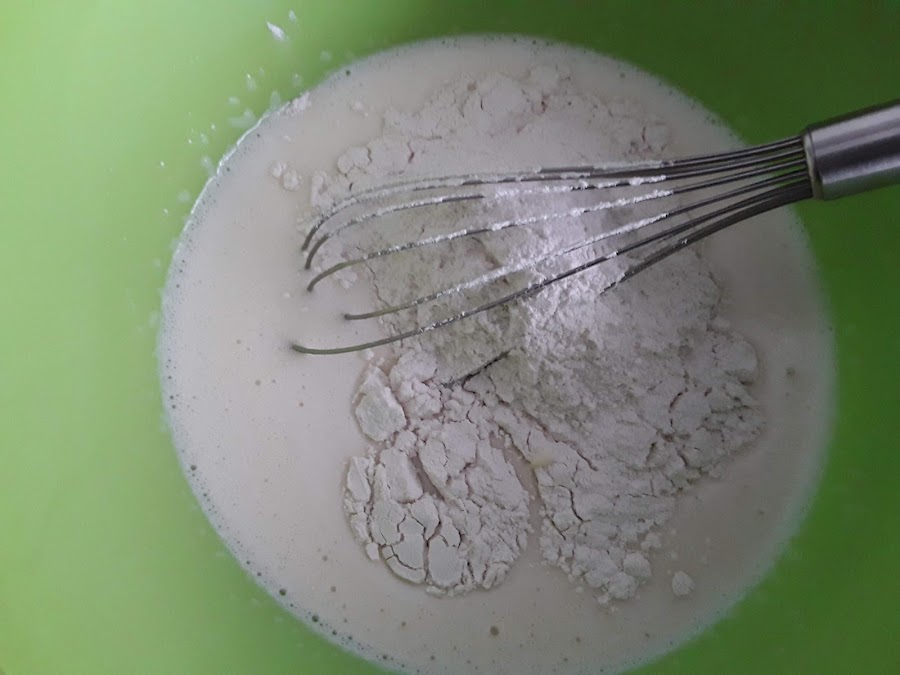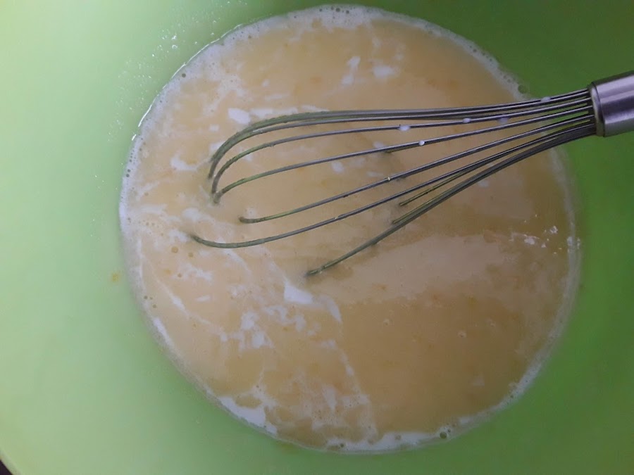 cuando esté bien mezclado incorporaremos la leche y misma operación que con las otras incorporaciones, mezclamos con las varillas,