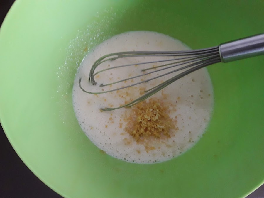 a continuación añadiremos a los huevos y el azúcar la ralladura del limón y mezclaremos con las varillas,