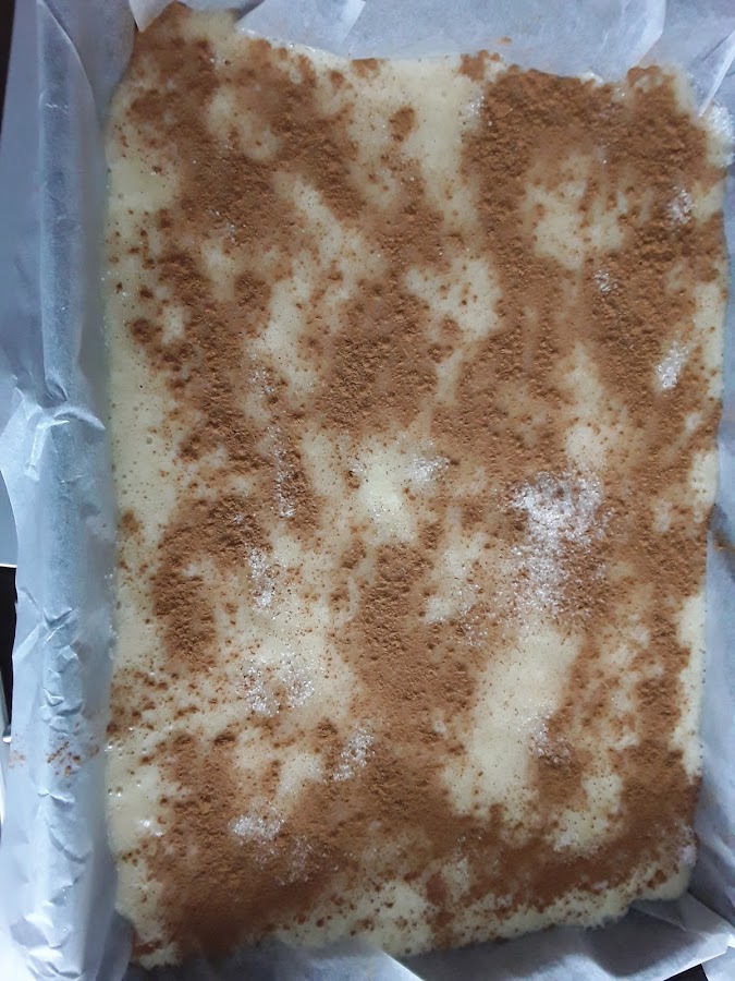 a continuación cogeremos azúcar y canela (esto es al gusto de cada uno) y espolvorearemos por encima de la masa que quede bien repartido porque esto después es la capa que queda crujiente por encima de la coca, veréis que resultado más bueno,