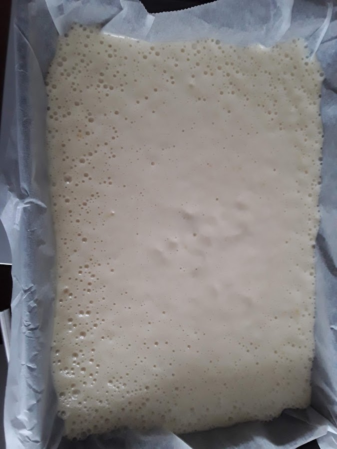 una vez ya mezclado cogeremos una "llanda" (bandeja para el horno cuadrada) y le pondremos papel de horno y echaremos la masa,