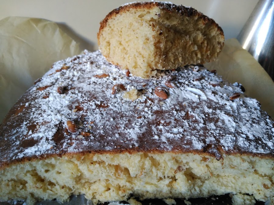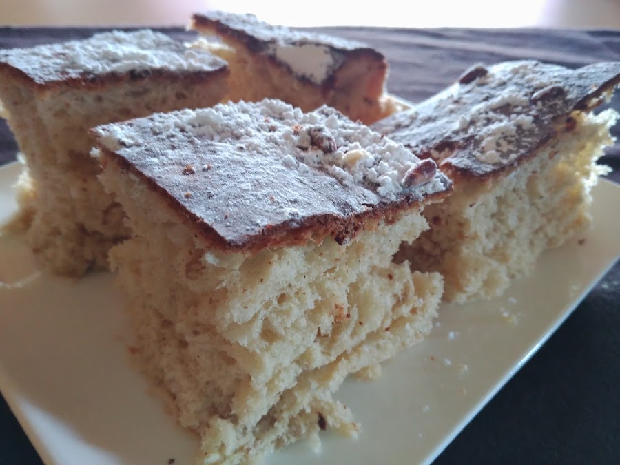 - Estiramos la masa en una bandeja de horno forrada con papel sulfurizado (de horno), esparcimos los piñones por encima, y dejamos levar el doble de su volumen. Como está haciendo mucho frío, si no conseguís que leve la masa, poner la bandeja un rato en el horno a 30º y veréis que rápido sube.