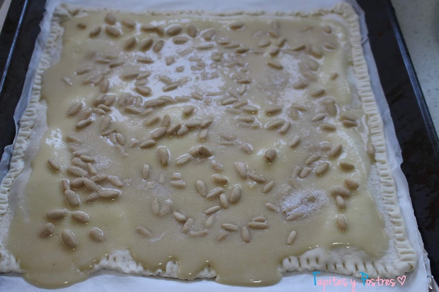 Espolvoreamos los piñones y el azúcar. Y al horno.