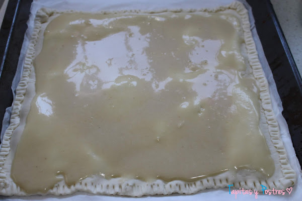 Extendemos la plancha de hojaldre y extendemos la crema pastelera.