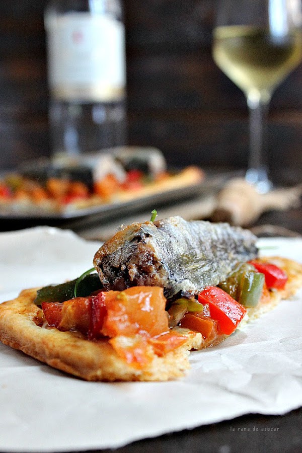 Montar el plato y encima de la coca vamos poniendo las sardinas.