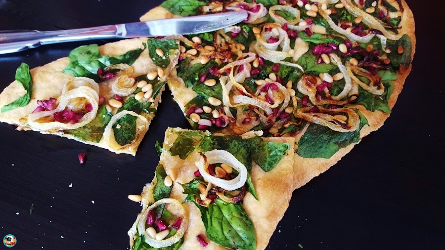 3.- Estiramos la masa con la ayuda de un rodillo, la cubrimos toda con las hojas de las espinacas, los aros de cebolla, los piñones y las granos de la granada. Precalentamos el horno a 200ºC: horneamos la coca 18 o 20 minutos. Cortamos la coca con un buen cuchillo de sierra y servir en platos.
