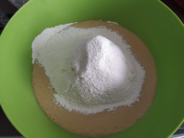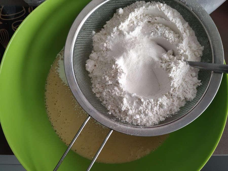 y procederemos añadir la harina y la levadura en polvo, lo haremos tamizando los dos ingredientes (esto lo haremos con la ayuda de un colador, iremos dándole unos golpecitos con la mano al colador), esto lo haremos para que coja un poco de aire y no quede muy fina ni muy compacta la coca,