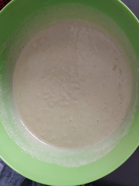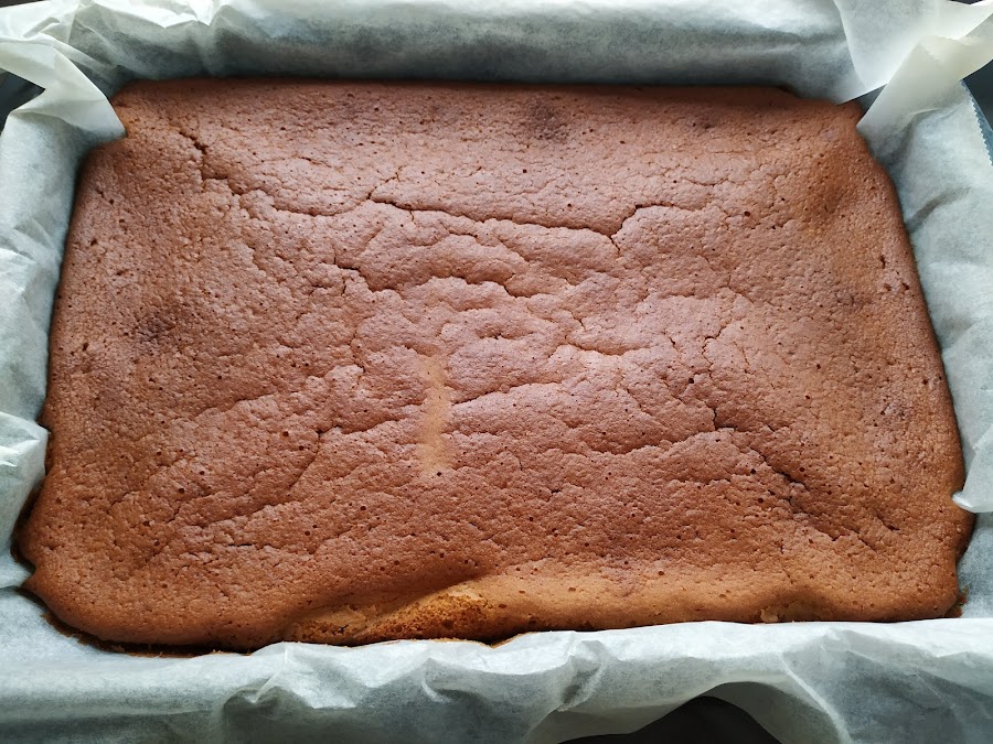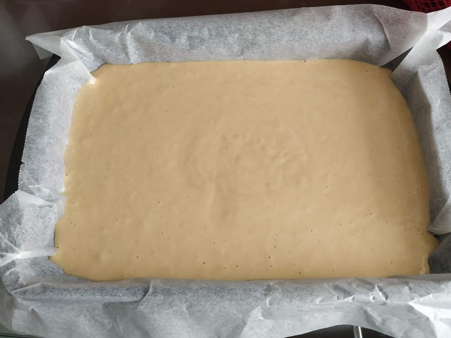 una vez lo tengamos mezclado cogeremos un molde rectangular para horno, le pondremos papel de hornear y verteremos el contenido,