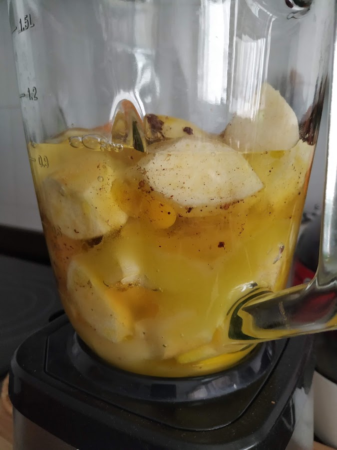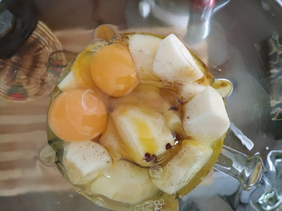 En primer lugar cogeremos las manzanas y las pelamos, les quitamos el corazón y las partimos en trozos, ahora las pondremos en el vaso de la batidora de vaso, a continuación pondremos los huevos, el azúcar, el chorrito de esencia de vainilla, el aceite, la canela, y cogeremos la naranja, le sacamos el zumo y lo añadimos también al vaso,