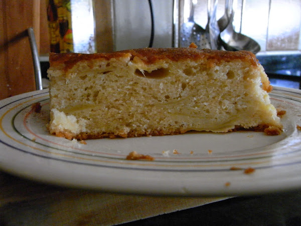 Se tamiza la harina junto con la levadura y se incorpora también y por último se pelan las manzanas y se cortan a lascas (como si fuera patata para tortilla je, je, yo con mis ejemplos) y se remueve todo con cuidado.