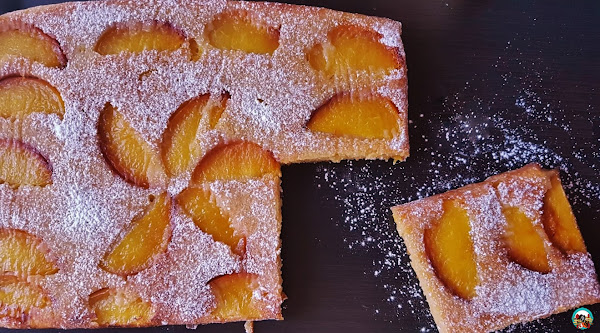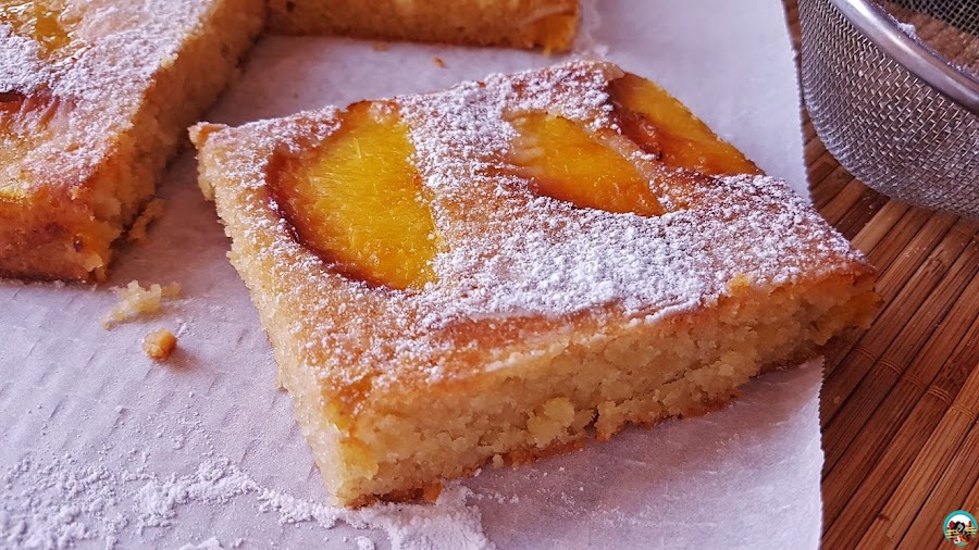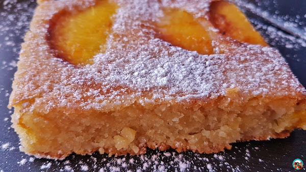 3.- Vertemos la mezcla en el molde sobre la fruta. Horneamos a 180º con el horno precalentado, la coca de melocotones 35 o 40 minutos, hasta que estén hecho y dorado. Retiramos del horno y lo dejamos enfriar sobre una rejilla. Servimos con un poco de azúcar glas por encima.