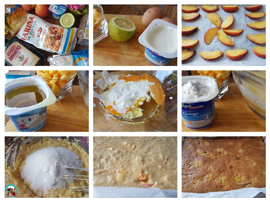2.- Preparamos el bizcocho: en un bol ponemos el yogur, 2 vasos de yogur de aceite de oliva, los huevos y el licor. Batimos todo bien con la varilla de mano, Añadimos la harina, la levadura, la ralladura de limón y la almendra. Lo batimos hasta que los ingredientes estén bien integrados. Agregamos el azúcar y mezclamos bien, incorporamos el melocotón cortado en trozos y lo mezclamos con el resto de los ingredientes.