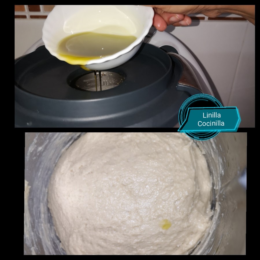 3. Ponga una jarra sobre la tapa y pese 100 grs de aceite. Reserve. Amase 3 min/espiga y vierta poco a poco el aceite reservado por la abertura. Retire del vaso.