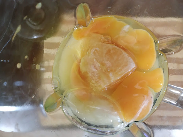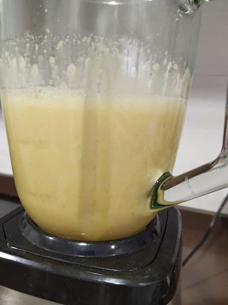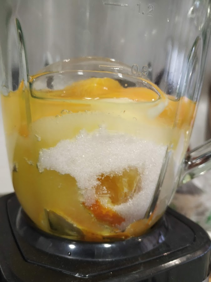 cuando le hayamos quitado la corteza la echamos a trocitos en el vaso, y quitamos lo blanco que queda de la naranja que lo desecharemos, y a continuación troceamos la naranja y la ponemos en el vaso de la batidora, a continuación ponemos los huevos,