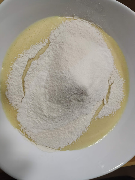 una vez esté bien batido lo ponemos en un bol, ahora cogemos y sobre la masa obtenida vamos a echar la harina y la levadura (tamizamos ambas cosas con la ayuda de un colador, dándole golpecitos),