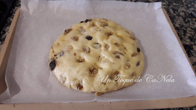 Dividir en dos y mezcla cada una con las nueces y pasas. Amasar para integrar.