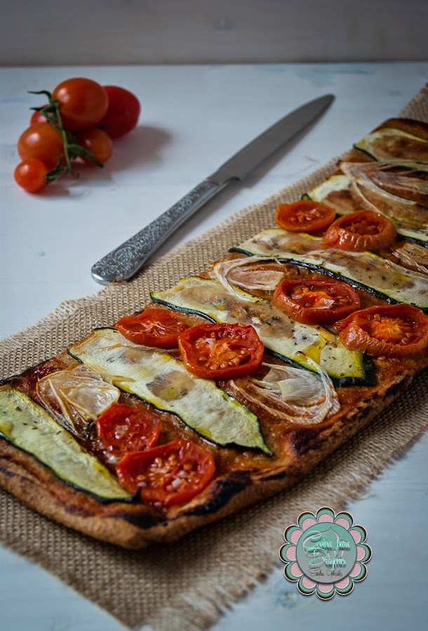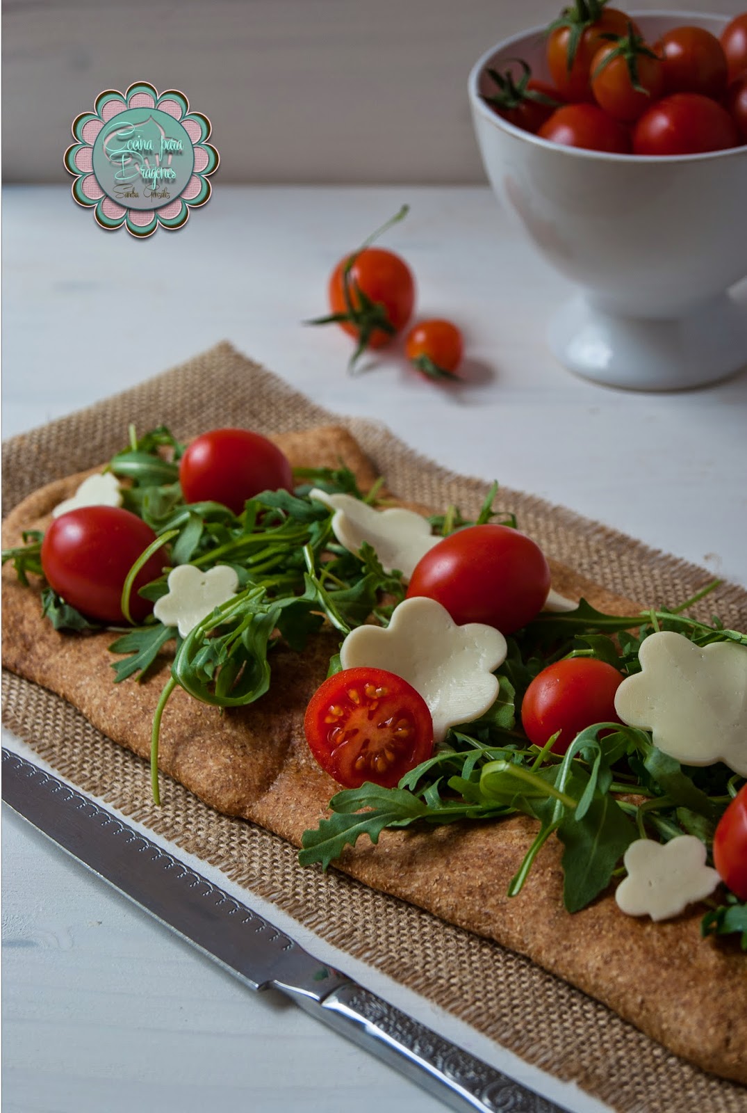 Si queréis celebrar algo, de manera sana, os traigo la receta de hoy. Se trata de una masa elaborada con harina integral. No es que haya empezado la operación bikini, aunque no iría mal... Es que ando experimentando con masas, esta, de harina integral. La receta es una adaptación de la de las chicas de Galeteria, pero en este caso he preparado una con verduras y otra con rúcula, tomates, queso y atún. No sabría deciros cuál me gusta más, la masa queda crujiente y contrasta con los ingredientes que le pongáis, así que, como os suelo decir: el límite está en vuestra imaginación.
