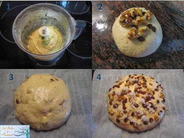 8. Pintar con huevo batido. Decorar con más pasas y nueces maceradas en la mistela o anís. Agregar azúcar ligeramente humedecida con el licor macerado.
