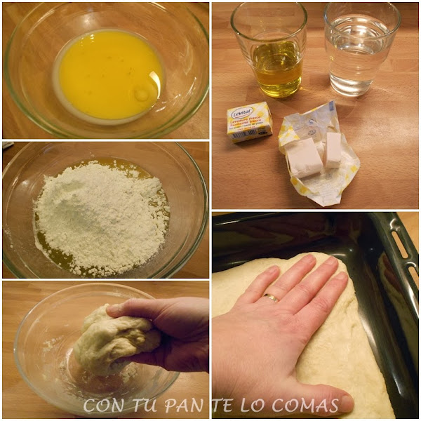 4. Vamos incorporando harina, una pizca de sal, y amasamos (poco, esto no lleva más de unos minutos) hasta que no admita más harina. Sabemos que no hace falta más cuando la masa se despegue de los dedos y del bol. La masa queda tirando a blanda.