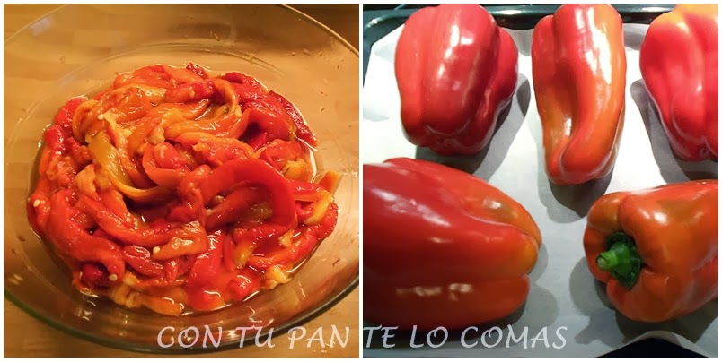 1. Asamos los pimientos en el horno a 190ºC, dándoles la vuelta de vez en cuando para que se asen bien por todos lados. Cuando estén hechos los dejamos templar para pelar, quitarles las semillas y dejarlos en tiras.