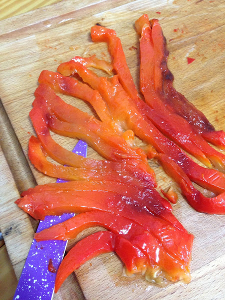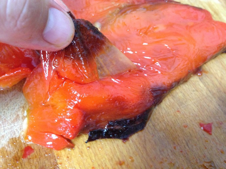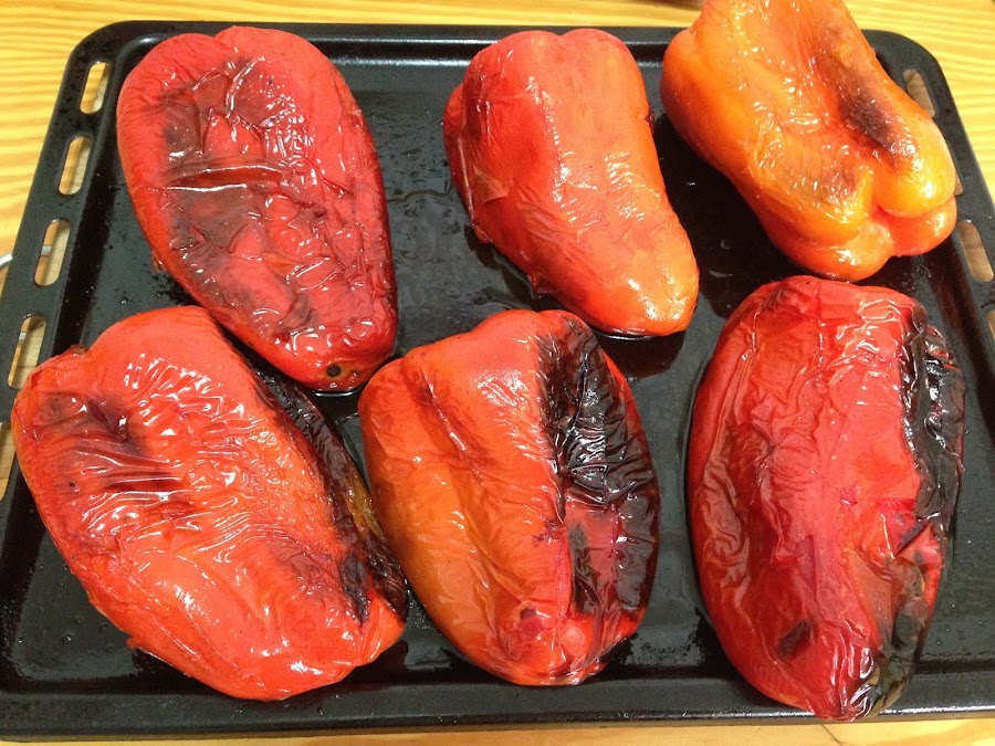 Cuando tenemos los pimientos asados los sacamos del horno, los dejamos enfriar un poco y los vamos pelando.