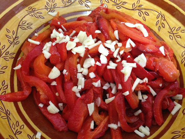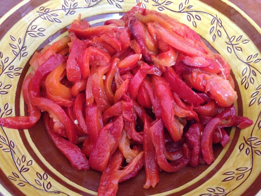 Cuando tenemos todos los pimientos pelados y a tiras los escurrimos para eliminar el líquido que hayan podido soltar y los volvemos a meter en un bol.