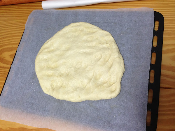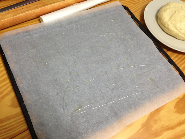 En una placa de horno extenderemos un papel vegetal para horno, lo untaremos de aceite y con los dedos iremos estirando la masa para que cubra toda la placa.
