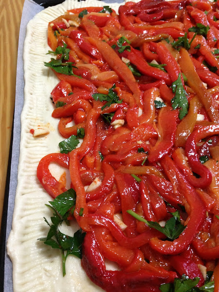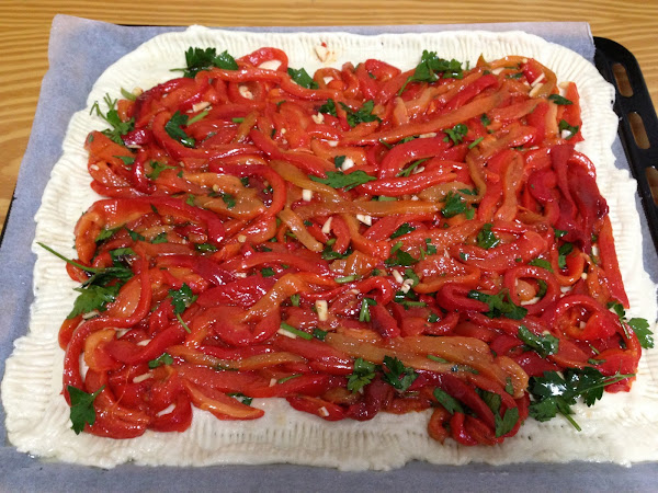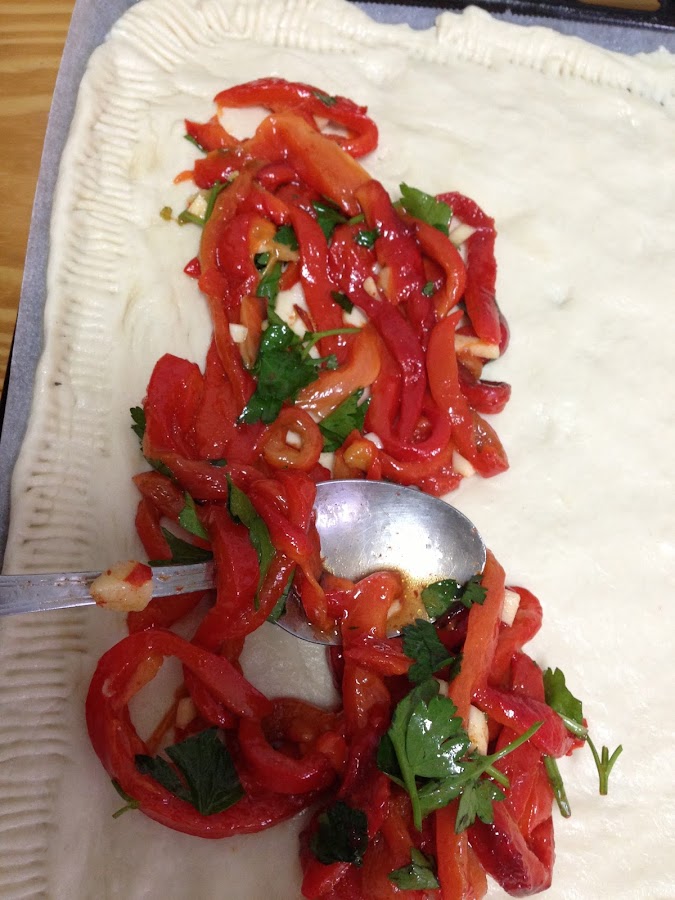 Ahora con una cuchara debermos extender los pimientos con ajo y perejil sobre la masa.