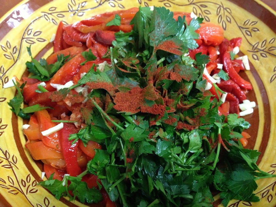 Picamos los ajos y picamos el perejil y se lo añadimos a los pimientos. Le añadimos la media cucharadita de pimentón dulce y la media de pimentón picante, un chorro de aceite, un poco de sal y removemos todo.