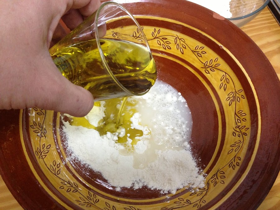 Para preparar la masa ponemos en un bol unos 100 gr. de harina, los 25 gr. de levadura, un pellizco de sal, el vaso de aceite y unos 150 ml de agua. Lo mezclamos y le vamos añadiendo el resto de agua y el resto de harina a medida que vamos mezclando.