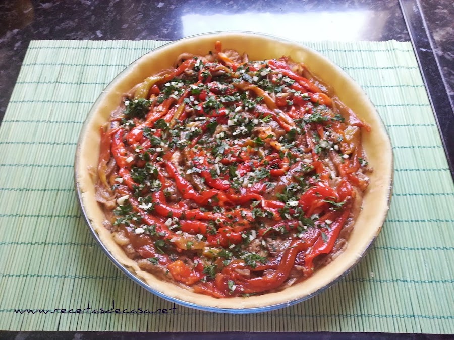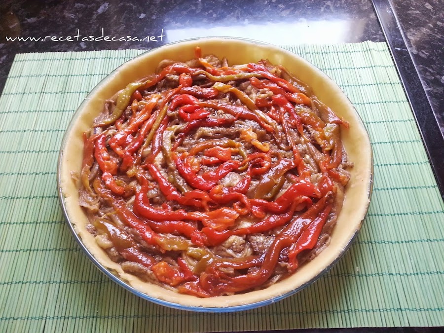 Una vez asadas las verduras y enfriadas, pelamos y troceamos en tiras. Cubrimos la masa.