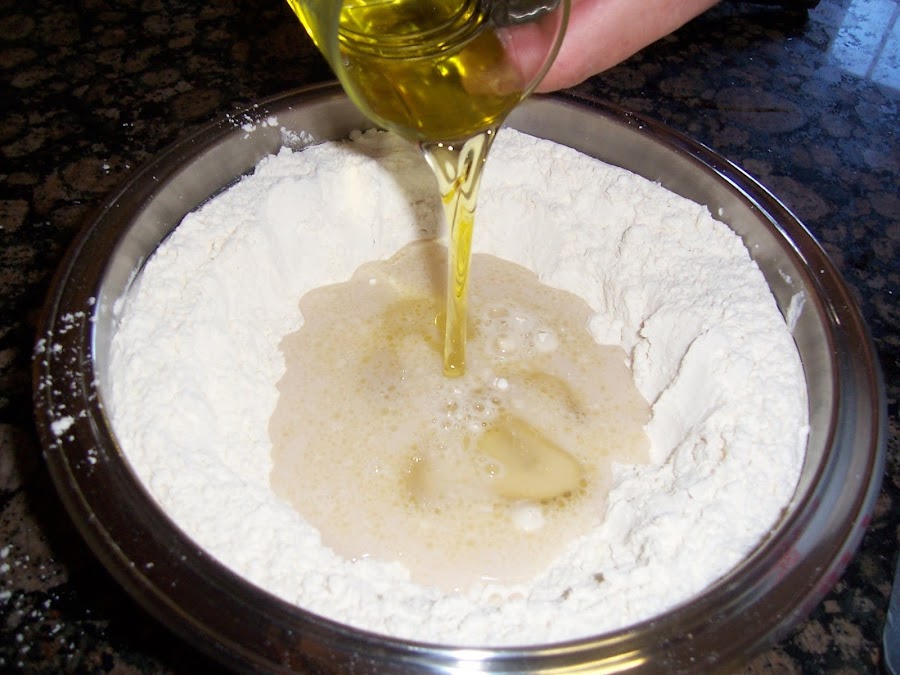 Hacemos un volcán en el centro de la harina y añadimos el agua con la levadura, la manteca, el aceite y amasamos bien hasta incorporar todos los ingredientes en la masa.