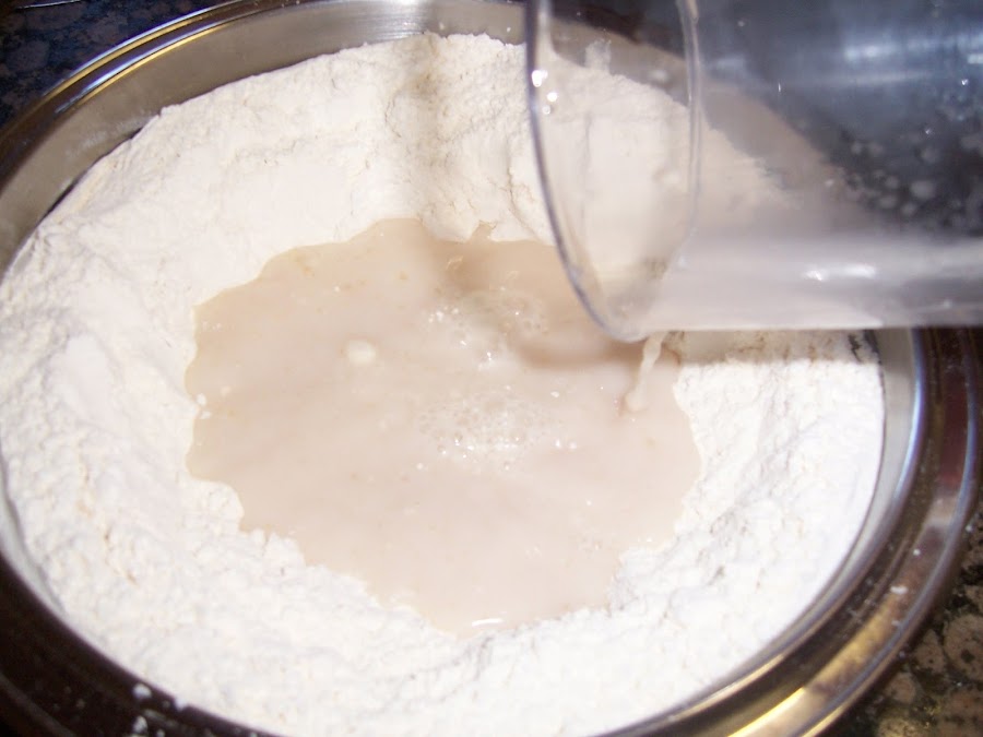 En primer lugar disolvemos la levadura en agua templada, no caliente y la dejamos reposar unos minutos.