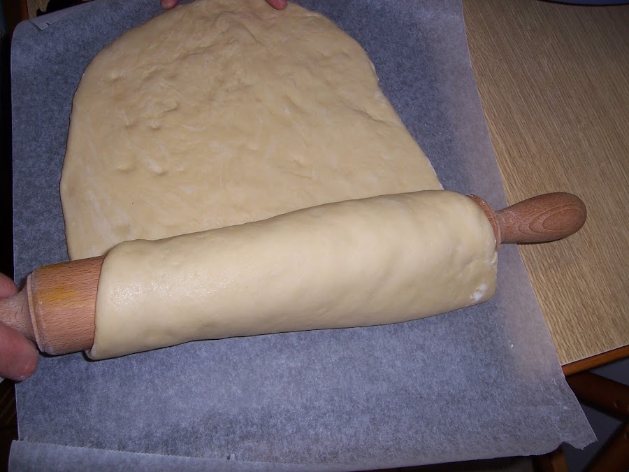 Cuando la masa doble su tamaño la amasamos ligeramente y la extendemos en forma rectangular, la pasamos a una llanda de horno y la dejamos reposar unos 15 minutos y mientras precalentamos el horno a 180º.