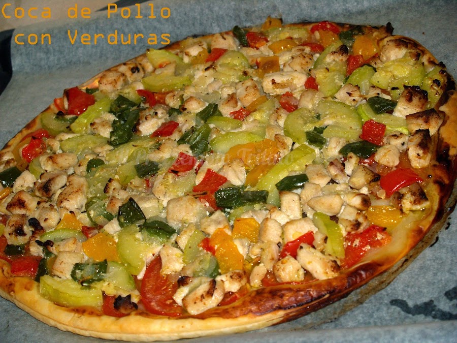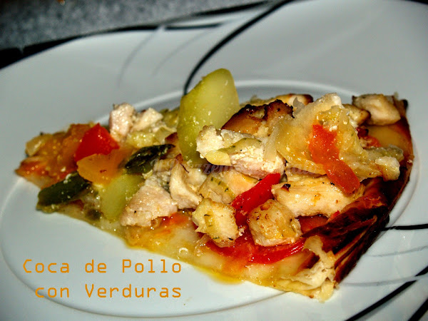 Extendemos la masa de hojaldre sobre la placa del horno que previamente habremos cubierto con un papel sulfurizado para hornear, después de extendida la masa la pinchamos con un tenedor para que no suba. Troceamos el tomate en rodajas muy finas y las ponemos en la base de la masa y las salamos, a continuación ponemos encima la mezcla anterior del pollo con las verduras y metemos al horno previamente precalentado a 200ºC, horneamos a 180ºC hasta que veamos que el hojaldre esta dorado. Sacamos, podemos servir y comer caliente o dejar enfriar y comer a temperatura ambiente.