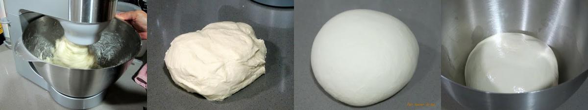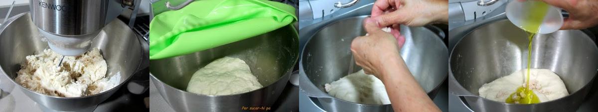 Amasar bien la harina y el agua y dejar reposar en un bol, cubierto por un paño húmedo, film plástico o silicona, aproximadamente 1 hora. Este proceso, que se conoce como autolisis, favorece el amasado del pan y que la harina se hidrate bien, lo que la deja en perfectas condiciones para la fermentación posterior.