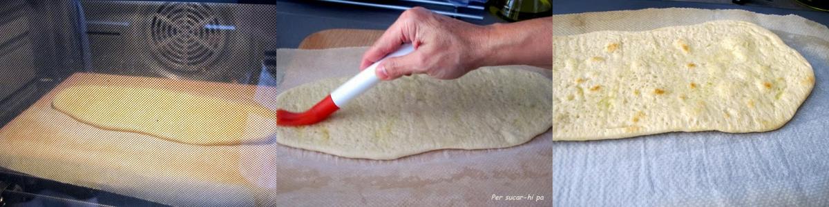 Cocer sobre papel de hornear directamente sobre la piedra (o en su caso una bandeja) durante 2 minutos. Sacar y pincelar de aceite la cara superior, volver a introducir en el horno y cocer 3 minutos más, en total 5 minutos. Pincelar de nuevo con aceite la parte superior.