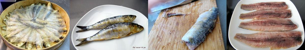 Limpiar los arenques. Para ello retirar la cabeza y las tripas. Cortar la cola y retirar la espina central, separando los dos filetes. Retirar las escamas de la piel. Lavar los filetes y secarlos con papel de cocina. Reservar. Se puede rebajar más el intenso sabor salado remojándolas en agua unas horas.